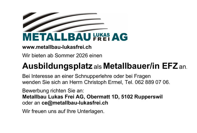 Metallbau Lukas Frei AG | Obermatt 1 D, CH-5102 Rupperswil | T 062 889 07 07 | F 062 889 07 00 | info@metallbau-lukasfrei.ch